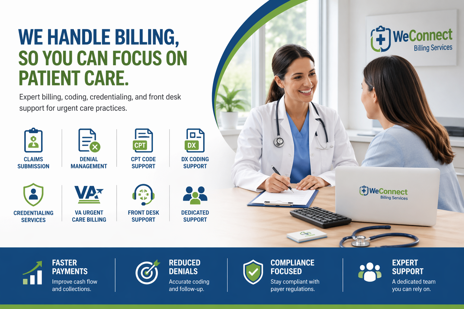 WeConnect Billing Services provides end-to-end urgent care billing and operational support designed to improve collections, reduce denials, and streamline workflows.In medical billing reporting, even small data errors can create big financial problems. That’s why our team focuses on accuracy, speed, and consistency at every step.